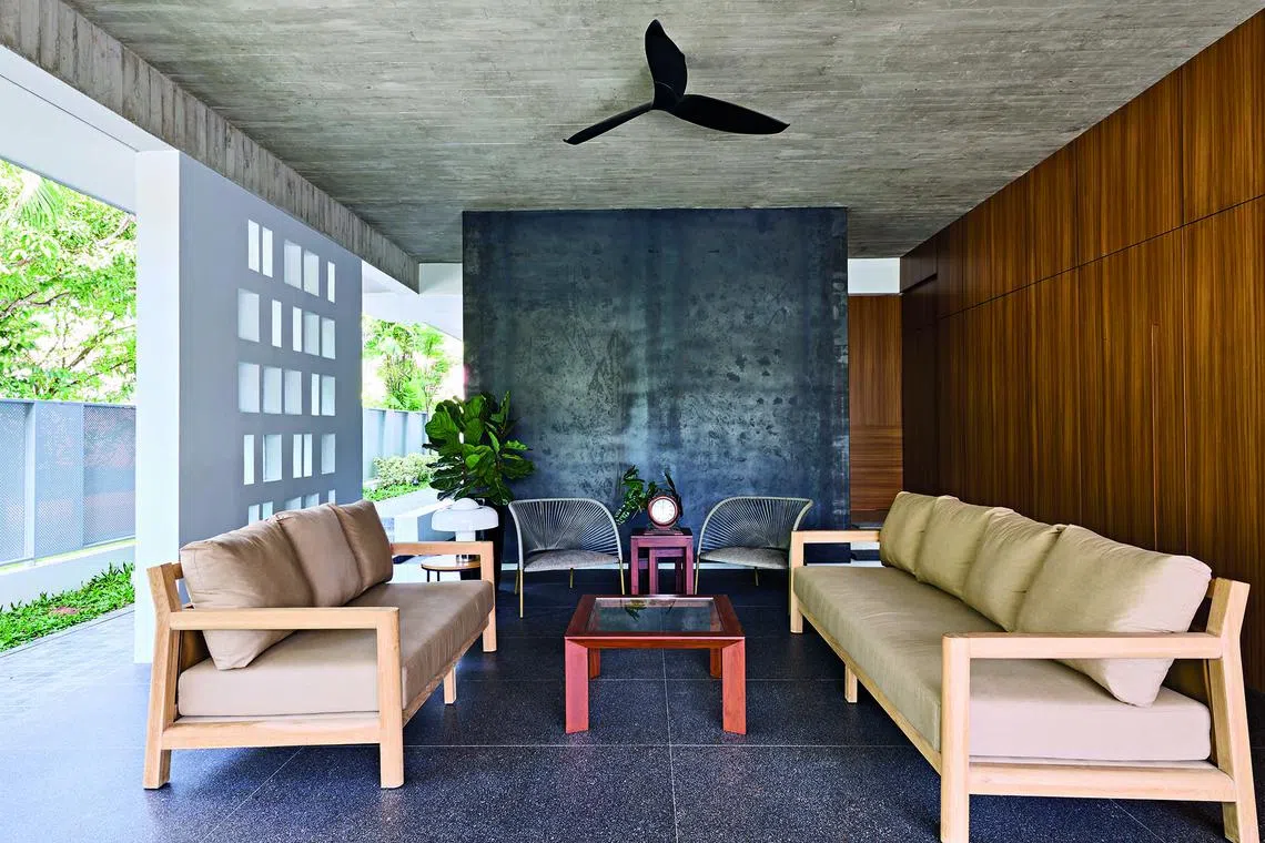 The open living area on the first storey – set back from the front gate and car porch for a semi-private feel – is a naturally ventilated space for the residents to host family and friends.