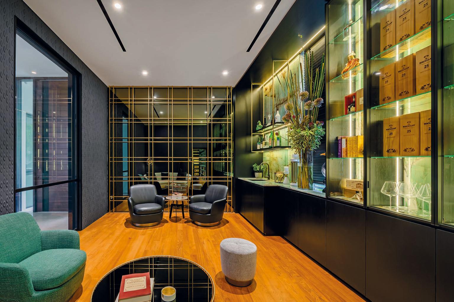 The adjacent wine-tasting room is an intimate space with a cosy lounge setting for sampling and appreciating wines. The main attraction is the Tiffany Quartz marble backdrop with its turquoise hue and dramatic veins. The dark veneer finish on the built-in shelves and cabinets is carried over from the wine cellar, reinforcing the connection between the two spaces.