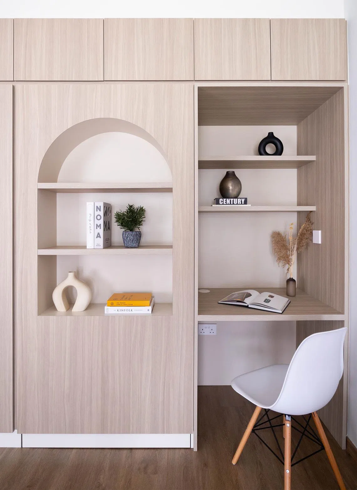 In the entryway of the flat, floor-to-ceiling carpentry conceals the electrical distribution board and shoe cabinet. There is also an arched settee where the couple can put on their shoes.