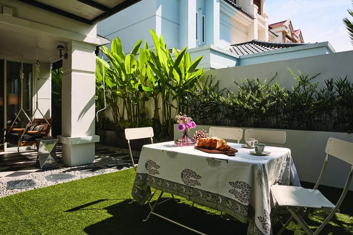 Next to the lawn and a tropical planter-lined boundary wall, the entrance porch is surrounded by greenery that gives it a sense of seclusion and tranquillity.