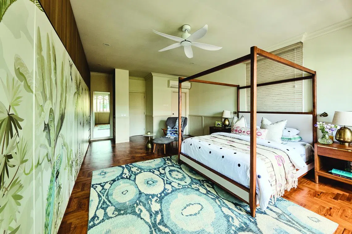 On the third storey, the existing partitions in the master bedroom were removed to create a more open layout. Ms Jain wanted a large wardrobe, but found the room’s size and layout could not accommodate a walk-in closet.