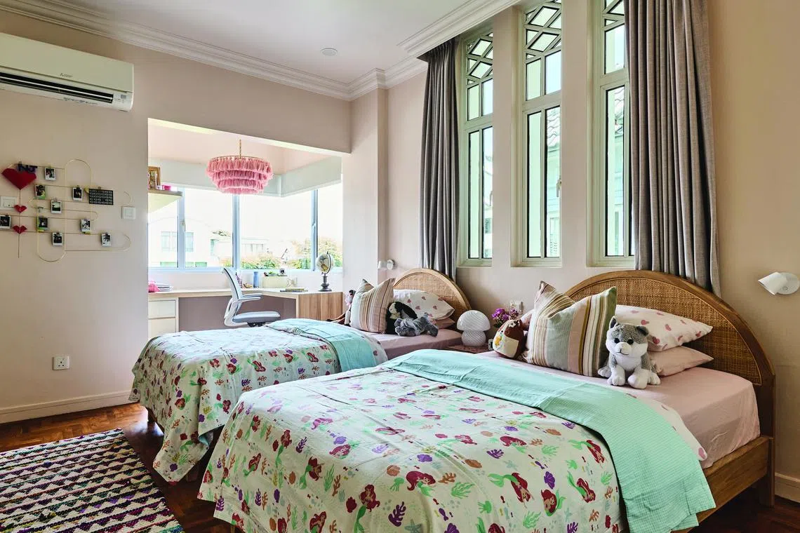 For the girls’ bedroom, the existing bulky cabinets were replaced with a study alcove and bookshelves. Light pink walls, a pink chandelier, and a pair of rattan and wood bedframes give the room feminine vibes without being overly cute.