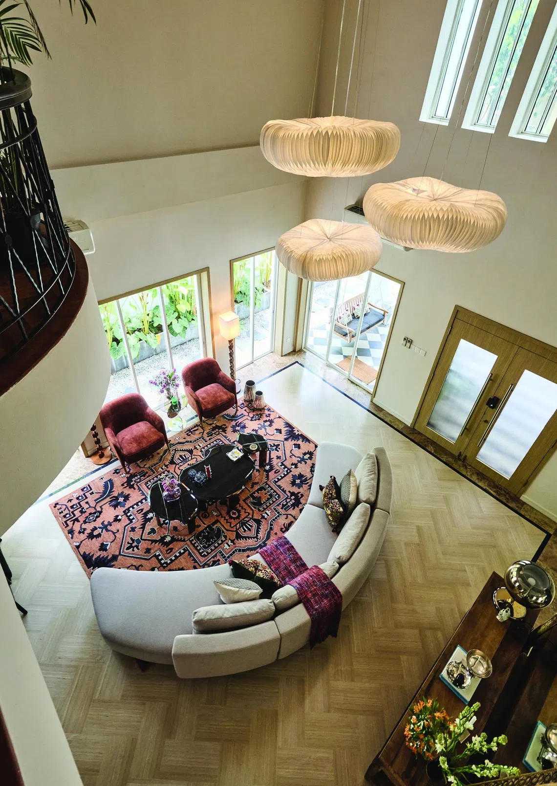 The double-volume living room has a palatial air, but feels welcoming, thanks to plush armchairs, soft furnishings and an oversized rug by Nasser Nishaburi.