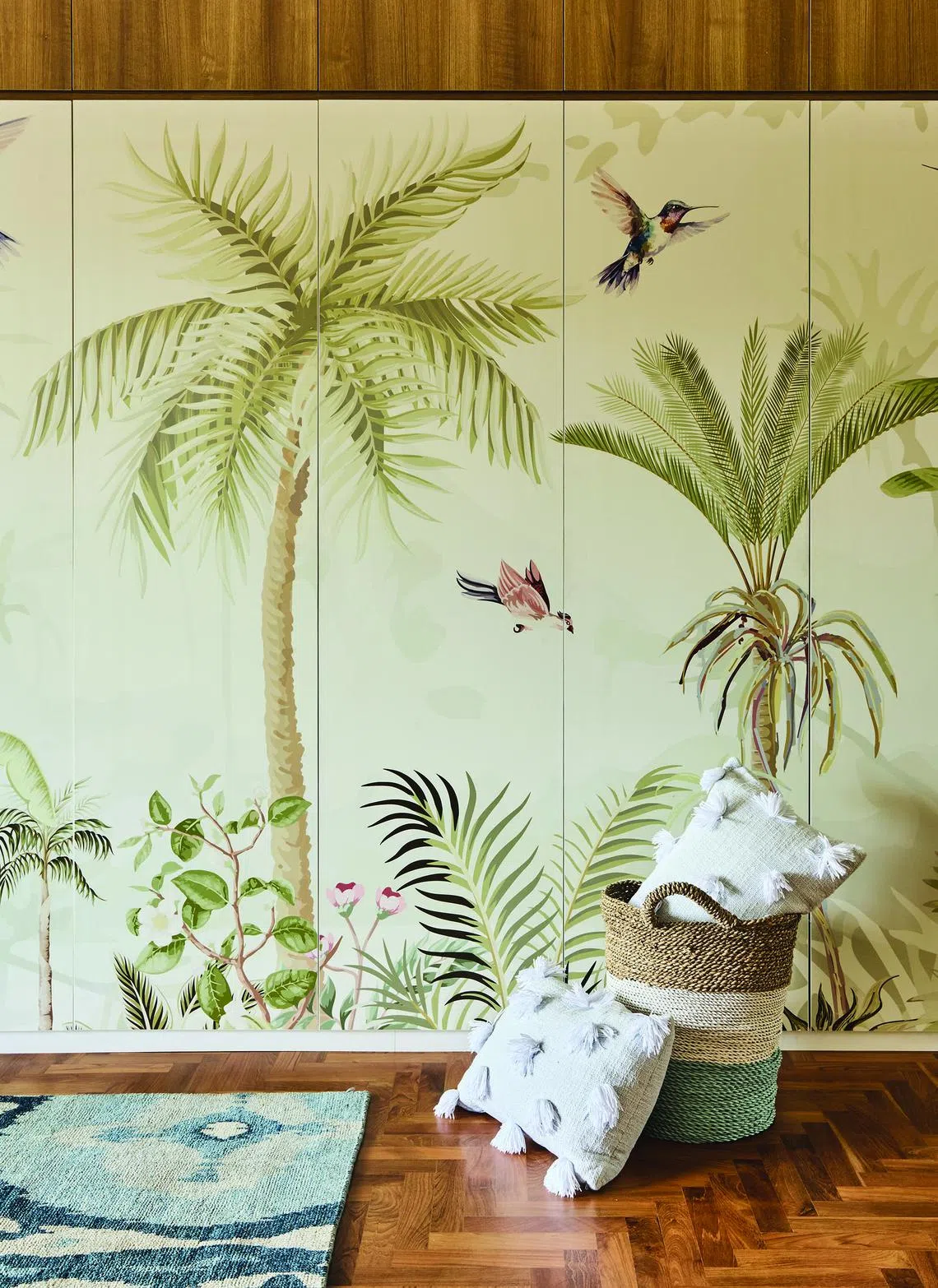She combined function and art by turning the wardrobe doors into a mural. “I managed to carve out a 7.5m-long wardrobe with sections for shoes, bags, belts and ties, along with a separate vanity area.”