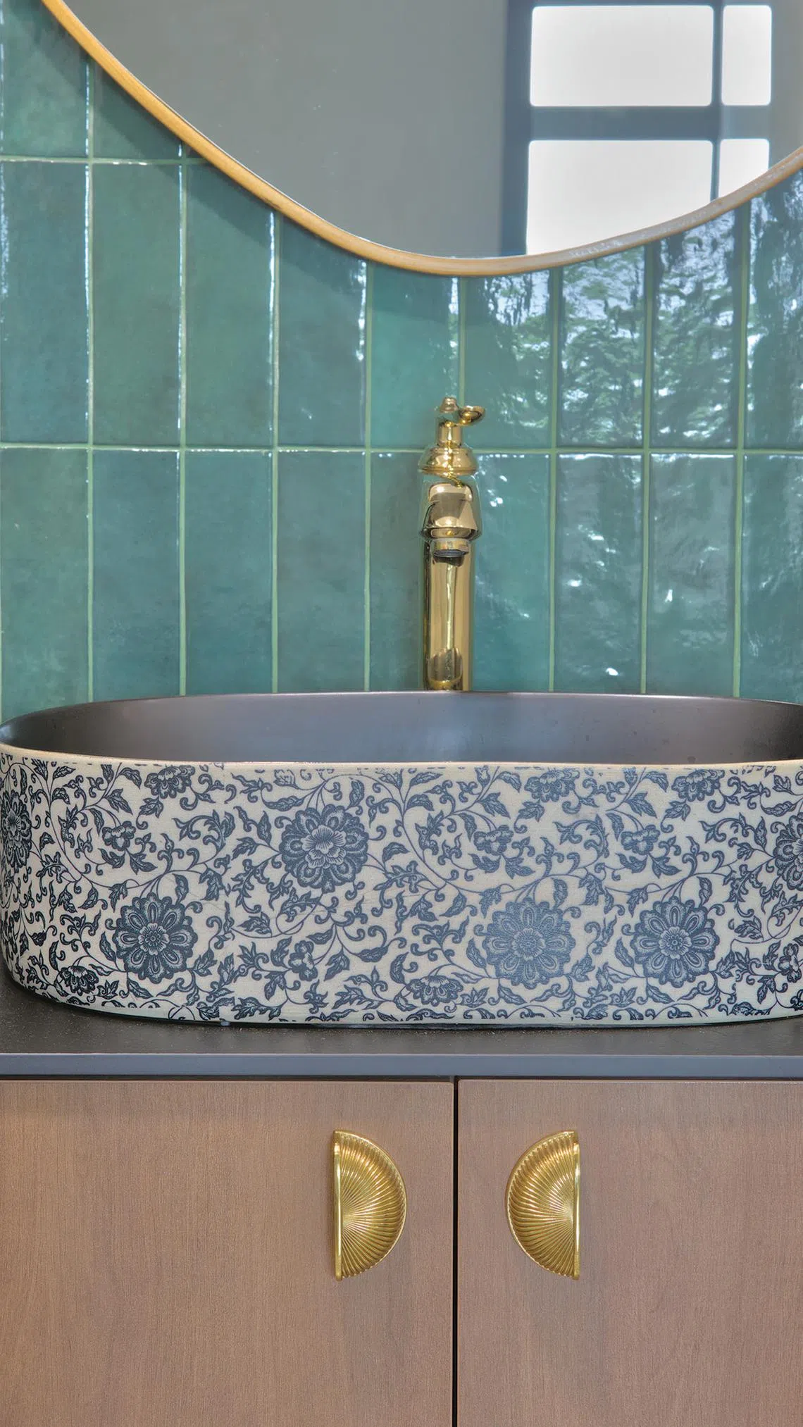 In the common bathroom, green wall tiles, brass fittings and black-and-white Peranakan-style floor tiles create a vintage-industrial vibe.