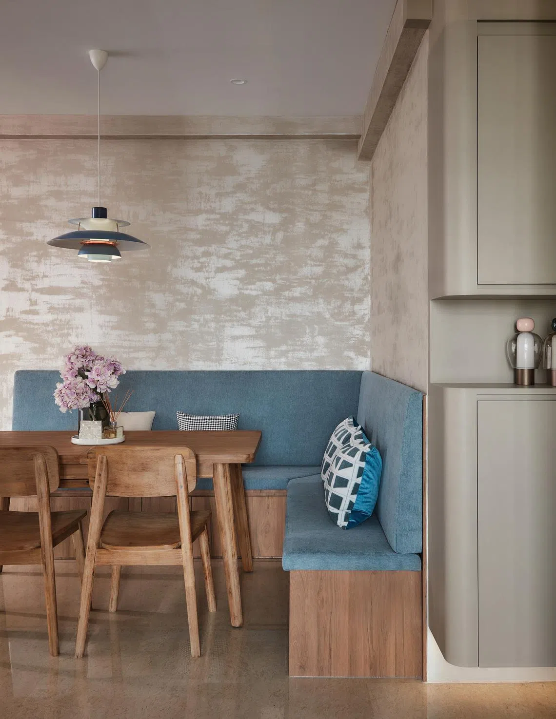 The dining area features a custom-made L-shaped settee upholstered in dusty blue.