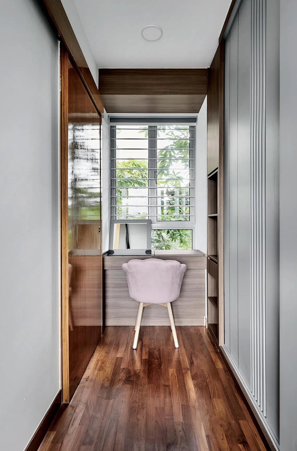 The walk-in wardrobe echoes a similar fluted design and grey laminate as the built-in cabinets along the entrance foyer to establish a sense of continuity. A little dressing table takes advantage of the well-lit space below a window in the walk-in wardrobe, with a flip-up vanity top and space underneath to store the home owner’s make-up.