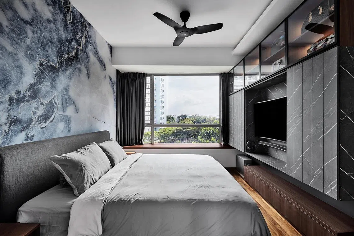 Every bedroom has a bay window, which Ms Bak has put to good use. In the son’s bedroom, the bay window has been transformed into a gaming desk with open shelves on the side, while the daughter gets a space to practise on her electronic keyboard.