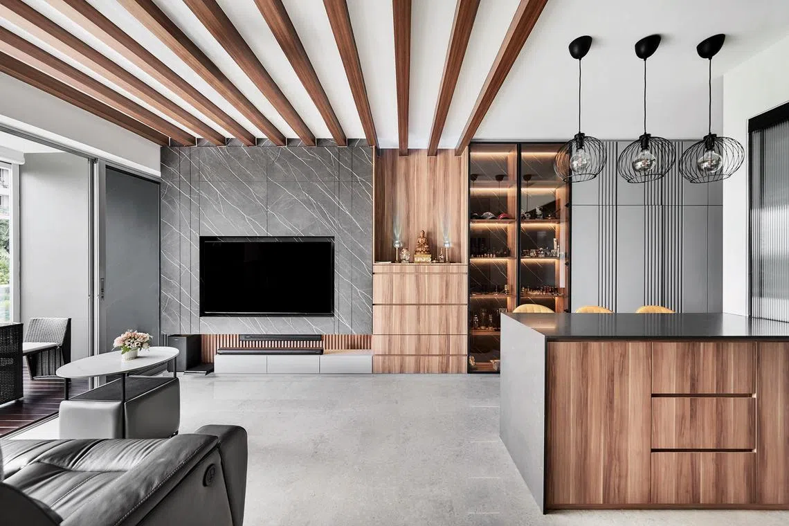 One of the biggest challenges was ensuring that the feature wall complements the adjacent altar and display cabinet. Instead of going for an identical match, Ms Bak introduced wood to the altar and display shelves, enriching the design scheme with another dimension.