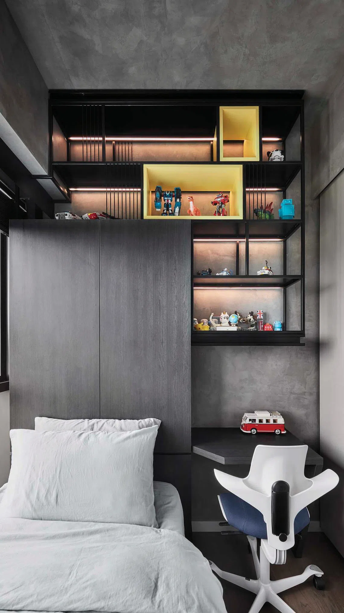 The wall space in the bedrooms was used to great advantage by building asymmetrical open shelves alongside closed cabinets. These are not only functional, but also inject artistic flair.