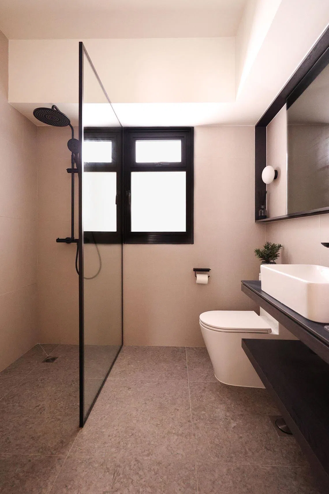 A black-framed glass partition separates the shower area, its stark lines softened by the light, stone-textured tiles that cover the floor and walls.