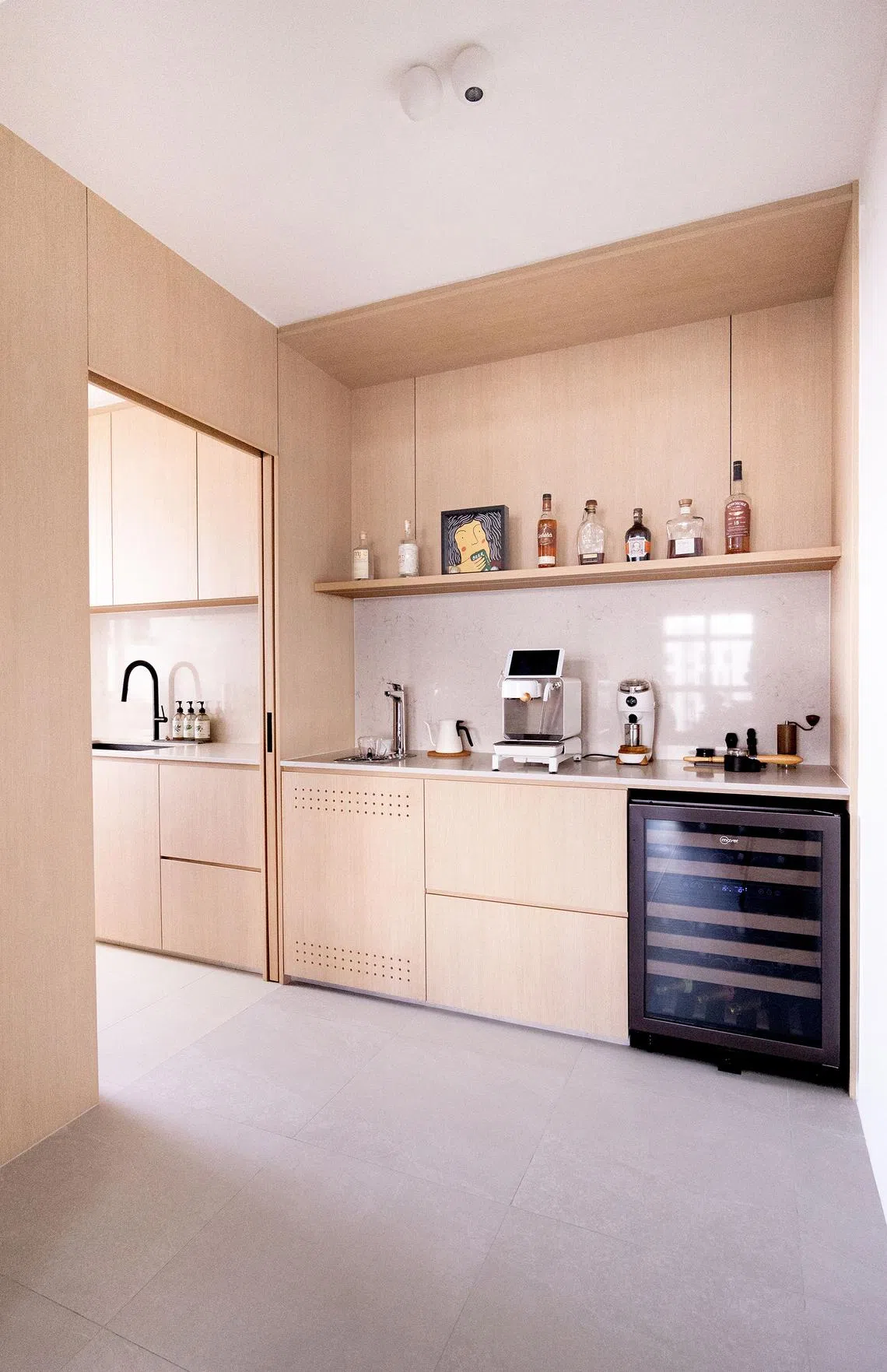 The door to the dry pantry, which is adjacent to the kitchen, opens up to a well-organised space with a compact coffee station and wine chiller.
