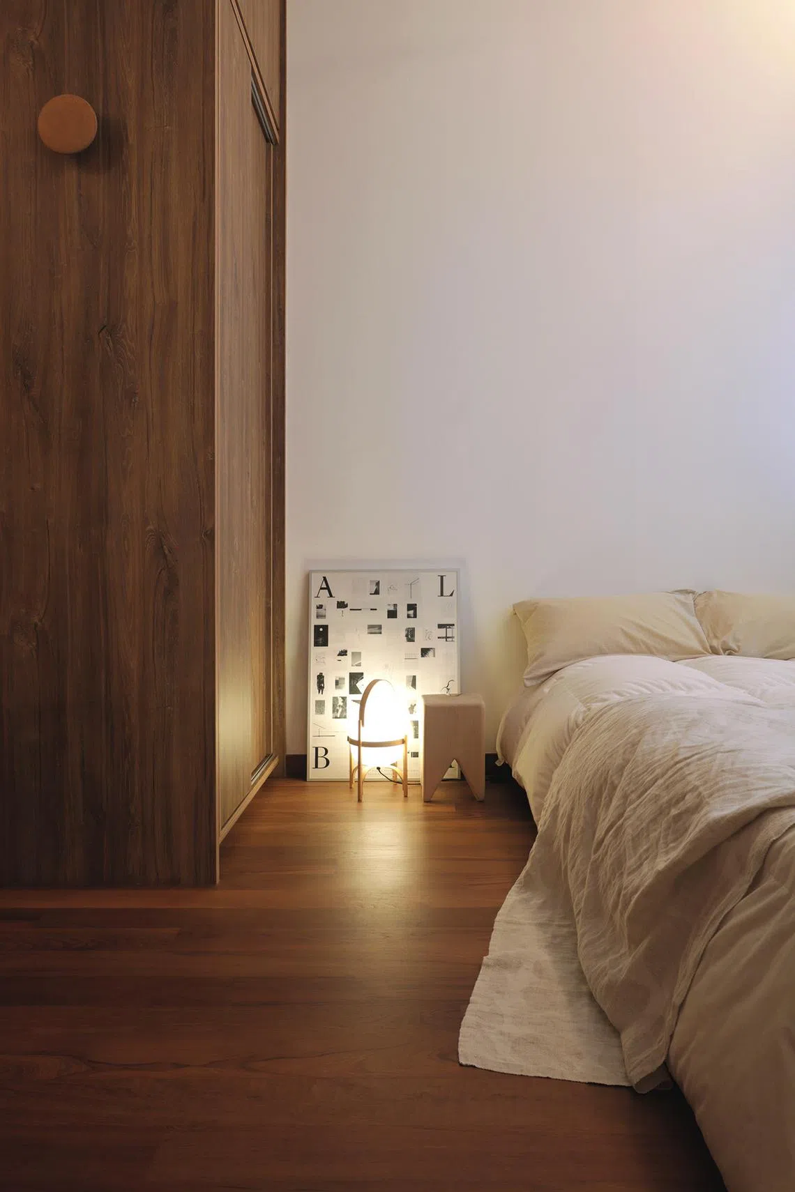 The designers matched the wardrobe with the existing timber flooring and furnished the bedroom with a futon from Muji and other accessories.