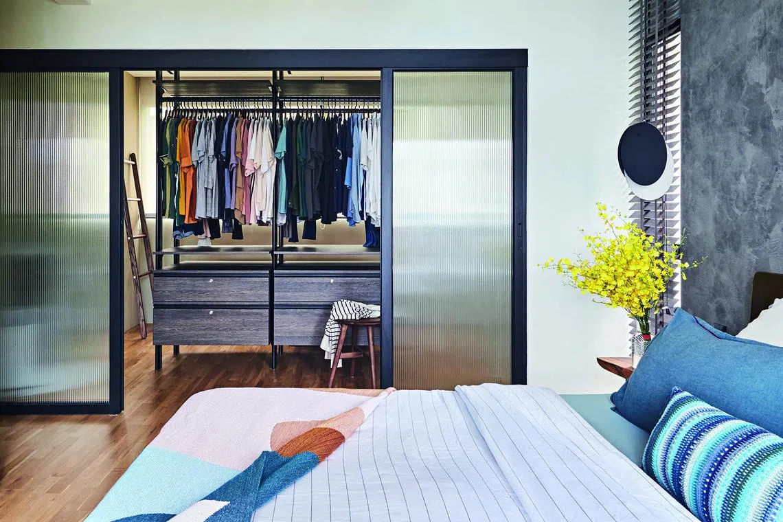 A set of fluted-glass sliding doors between the spaces offers privacy without compromising on openness or blocking natural light. Fluted-glass panels are also used in the two small top-hung windows in the attached master bathroom.