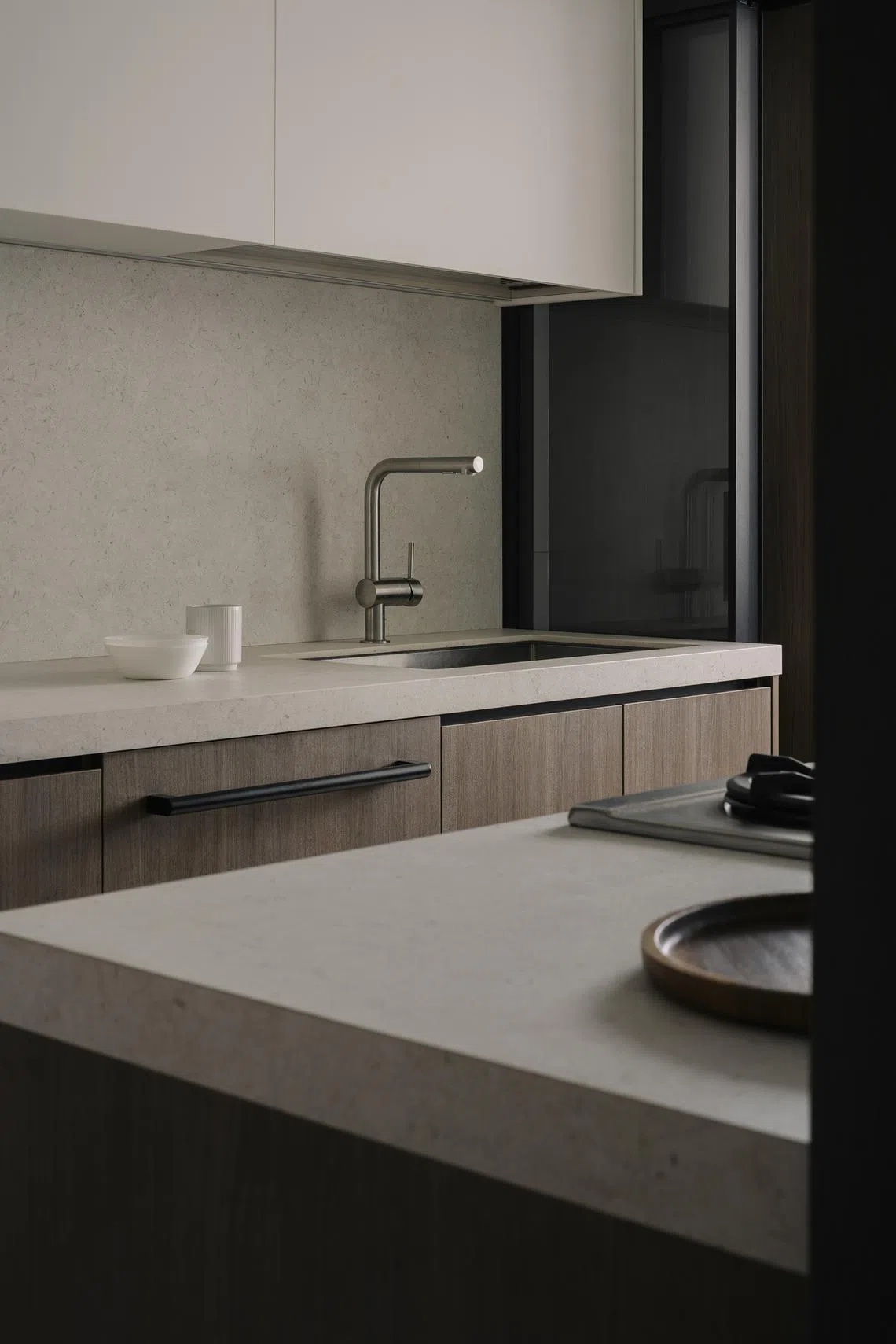 Darker, moodier finishes in the kitchen make for low-maintenance surfaces.