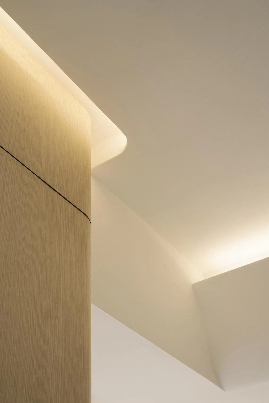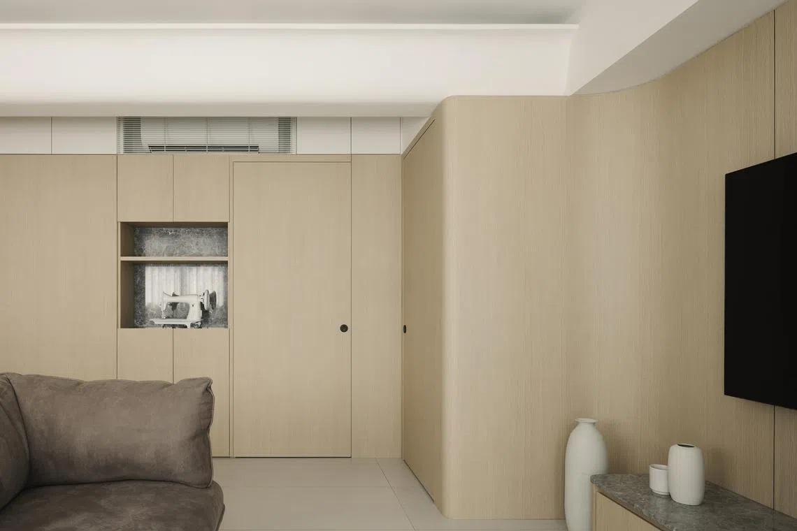 The focus on rounded corners extends to the television wall, where the curves soften the space.
