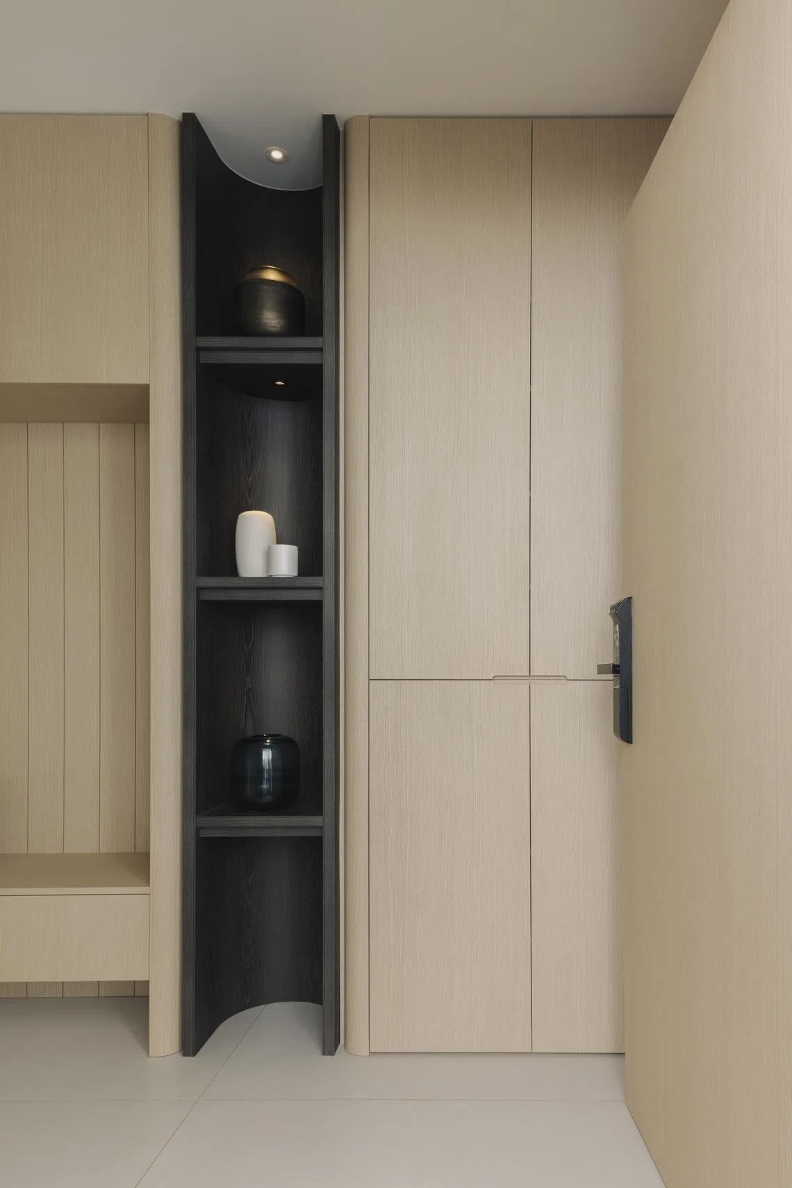 This foyer serves as a buffer zone that hides the living area from the corridor outside.