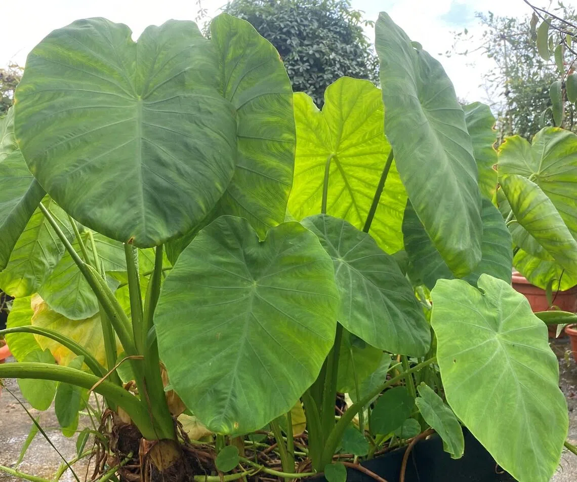 Finally, the yam (Colocasia esculenta), also known as taro, grows here in two varieties: the large yam and baby yam. It can thrive in wet and dry conditions, and produces large, shield-shaped leaves.
