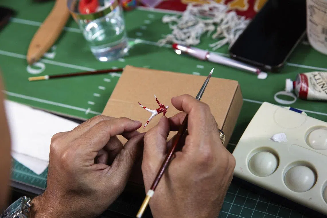 He experimented with clay, aluminium foil, phone wires and even old chewing gum pulled from the bottom of church pews, twisting each material into tiny drivers for his cars. He soon expanded his repertoire to miniature athletes and finally landed on the perfect material in his mum’s Wrigley gum wrappers.