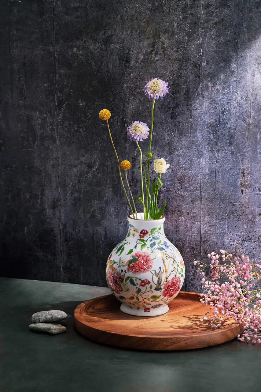 Shanghai Tang's E. P. Vase, art by Kelly Ser Atelier, and The Balcon du Guadalquivir tableware range from Hermes.