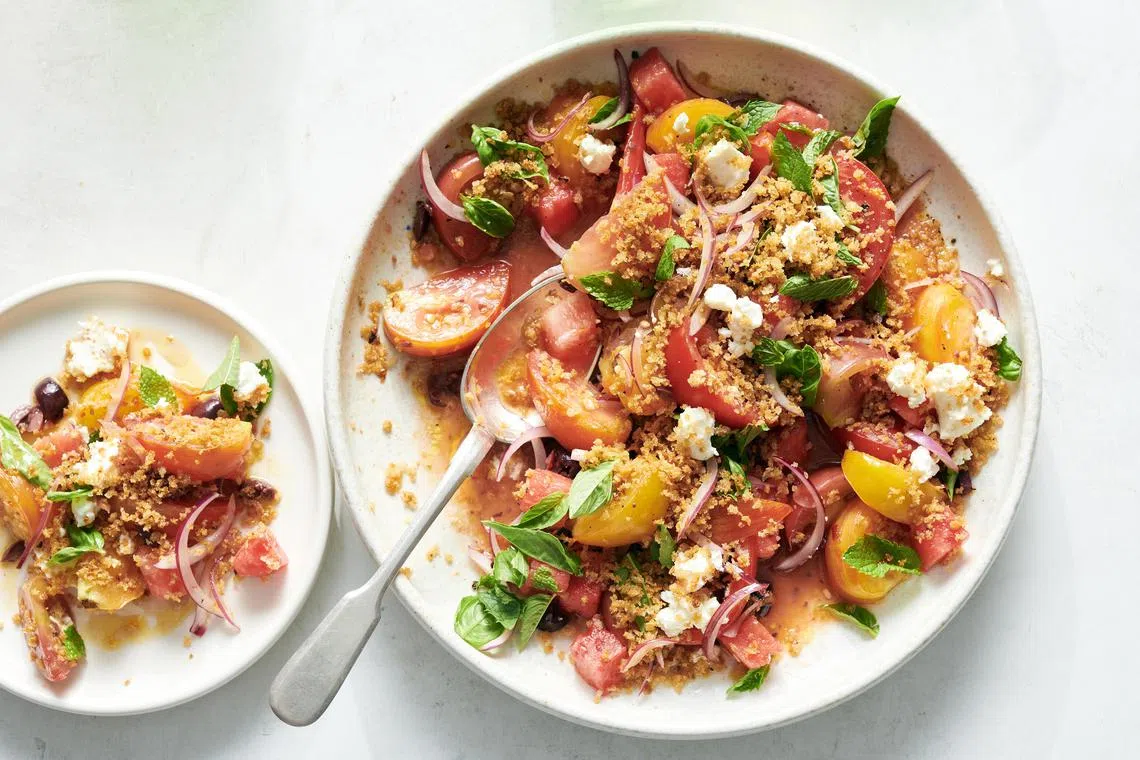Tomato-watermelon salad with anchovy bread crumbs: Two summer classics - tomato and watermelon - are showered with savoury, garlicky bread crumbs.