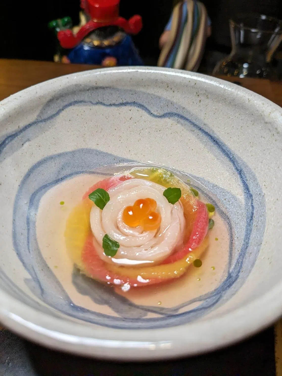 Besides the food, there is a lot to take in around the counter. The lights are dramatically dimmed to spotlight the shaving of strawberry-flavoured ice over a sweet-meets-savoury take on Caprese salad. Diners can entertain themselves with a joke book with colouring pages if they are not already bantering.