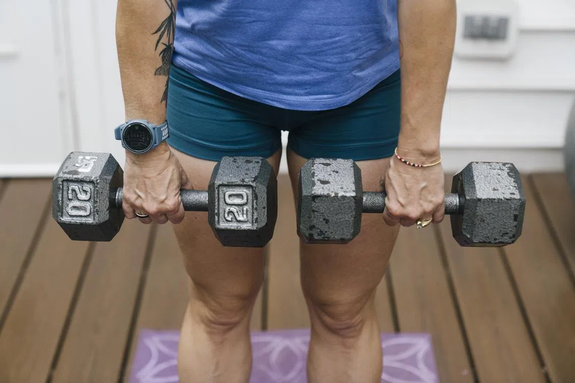 Ms Alison Gittelman, an experienced marathoner and triathlete, uses a weight with an exercise at her home.