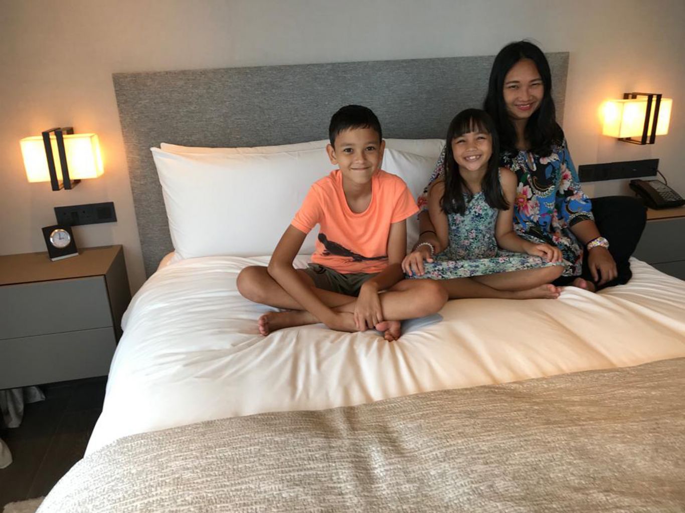 ST journalist Venessa Lee (right) with her son Micah and daughter Leah, are pictured at the Oakwood Premier AMTD Singapore two-bedroom executive apartment.
