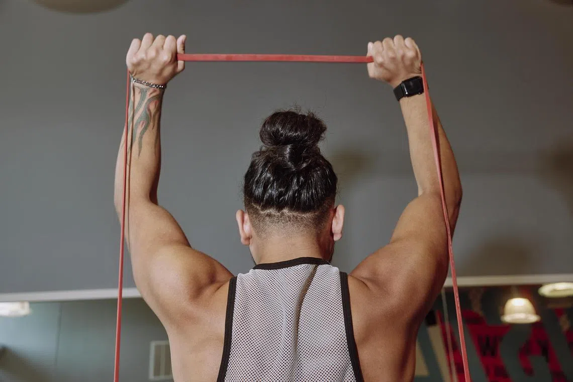 A looped band can go just above your knees for hip-strengthening exercises such as clamshells and monster walks, and you can use a longer band with handles for overhead presses and rows, Ms Stephens said.