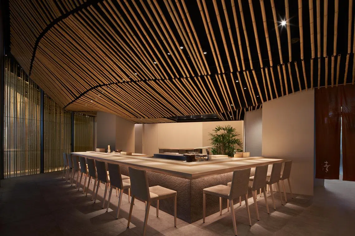 Suzuki, a Japanese restaurant at Mondrian Singapore Duxton in Duxton Hill, features a ceiling of undulating bamboo from Kyoto.