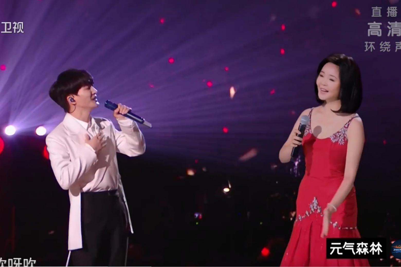 Chinese singer Zhou Shen (left) with a hologram of late singer Teresa Teng at Jiangsu Television's New Year Countdown Concert.