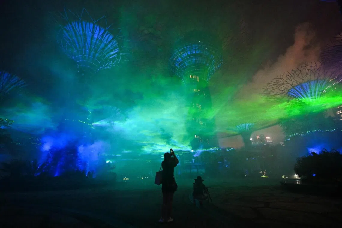 The Northern Lights are recreated when beams of light travel through cloud particles produced by machines mounted on the trunks of the Supertrees.