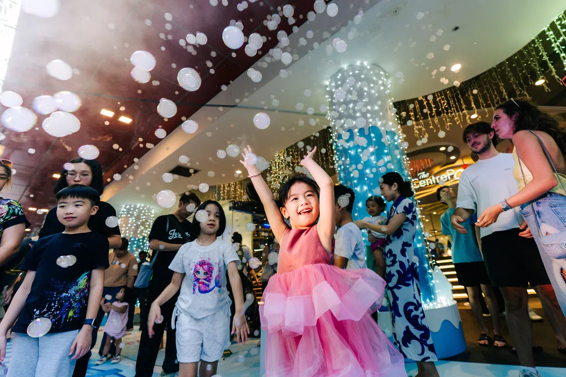 Children enjoying a bubble show at The Centrepoint in Orchard Road.