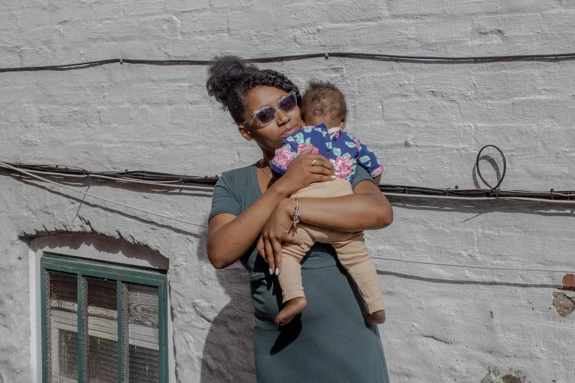 Ms Janelle Jones, a nurse and mother of two children, with her eight-month-old daughter, Eva, in Queens, New York.