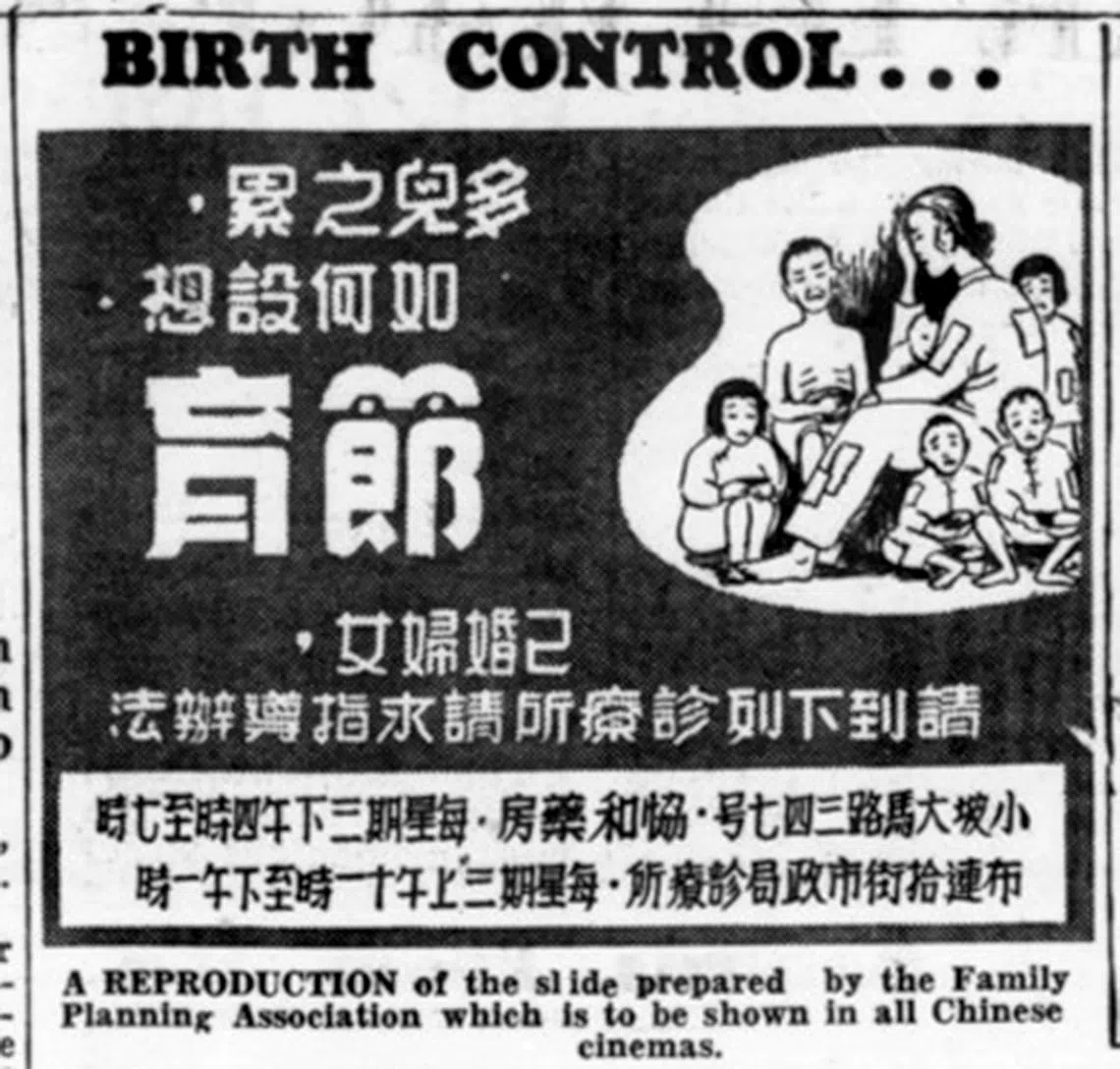 One slide screening shown in local cinemas by the Singapore Family Planning Association (FPA) depicted a weary Chinese mother with six children, holding empty rice bowls. The accompanying text asked: “Can you stand the burden of having so many children?”