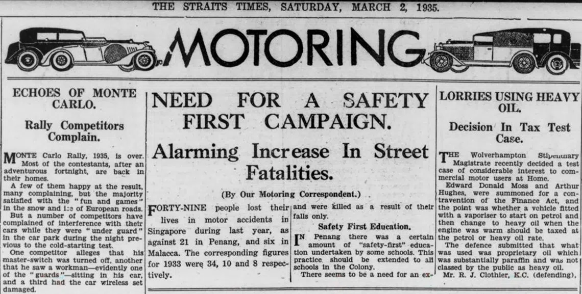 The first recorded mention of a call for a road safety campaign in ST’s archives came in 1935, when the paper’s motoring correspondent called for a “Safety First campaign” after 49 people died in motor accidents the previous year.