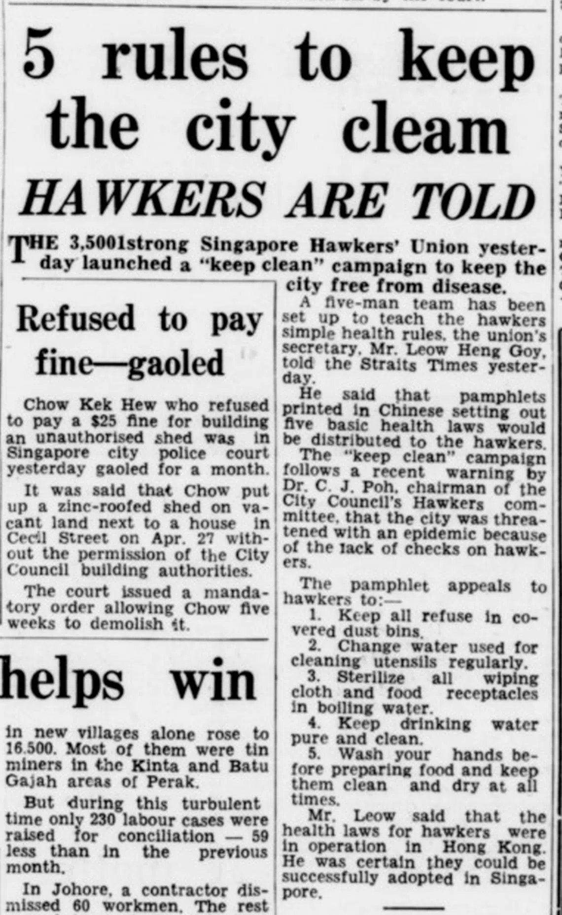 In one 1953 “keep clean” campaign in Singapore, a 3,500-strong hawkers’ union laid out five public health rules which included keeping all refuse in dustbins and handwashing before food preparation.
