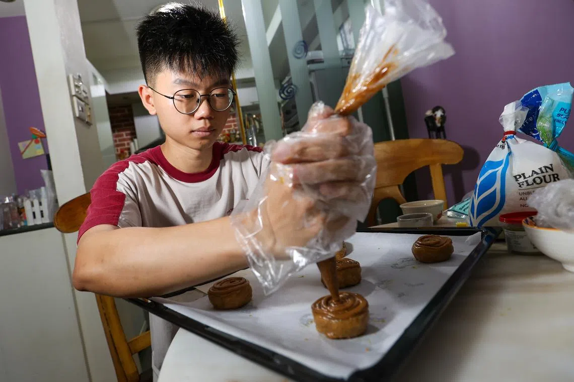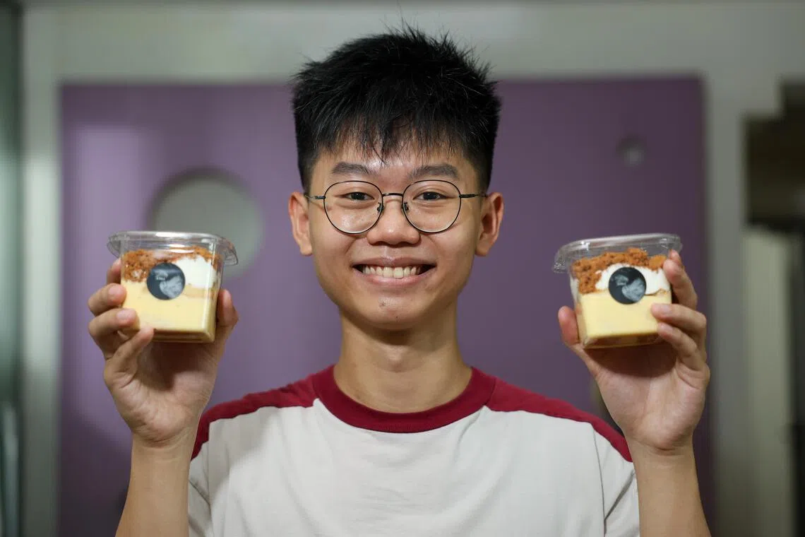 Most of his baking takes place on Sundays in the 6 sq m kitchen of his family’s five-room HDB flat in Woodlands. He spends eight hours preparing dough and assembling parfaits before transporting them to campus for collection later in the week. The drinks are prepared in his dorm room closer to pick-up.