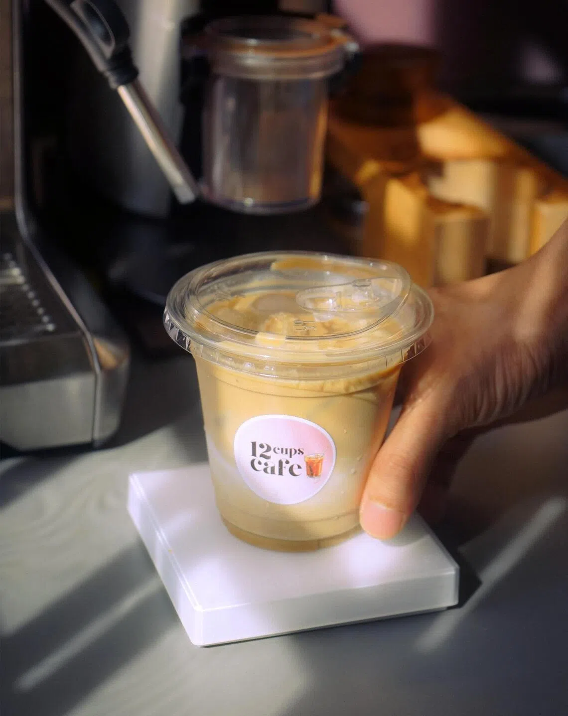 The Year 1 maritime studies student runs 12 Cups Cafe from his room, offering Americano ($3.50 hot, $4.50 iced), latte ($4 hot, $5 iced, with oat milk available for an extra $0.50) and iced mocha ($5).