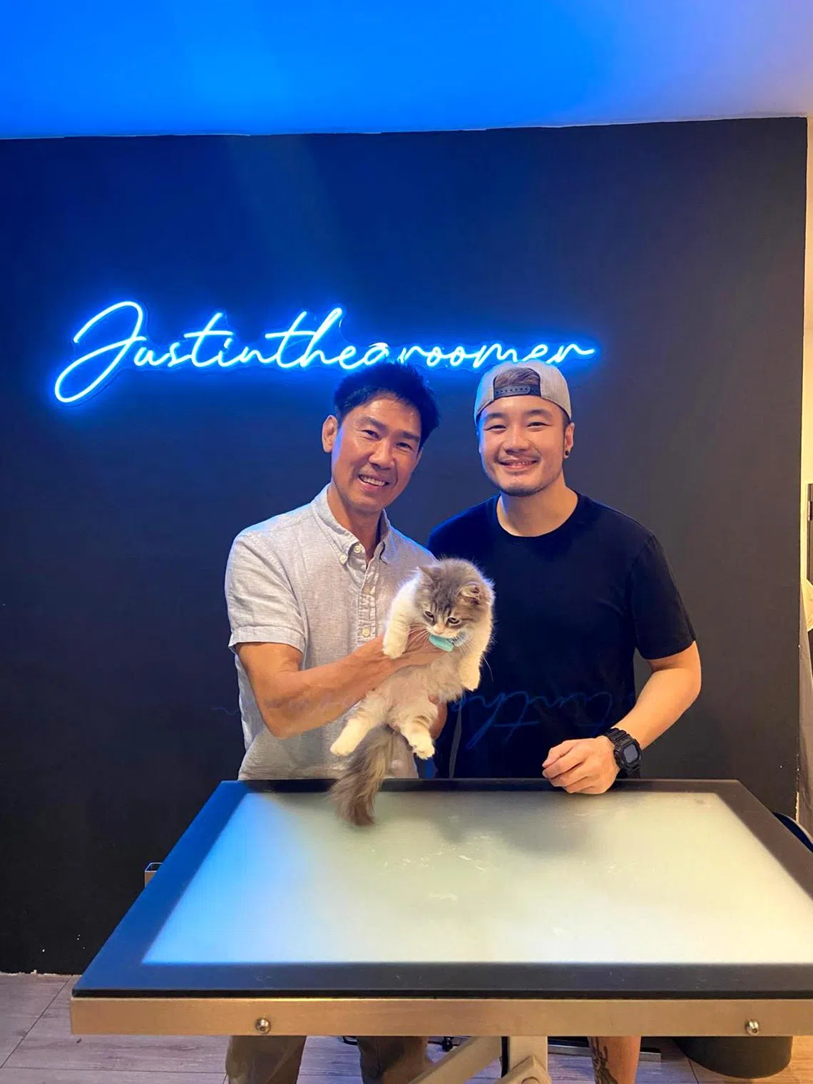 Edmund Chen (left) and his munchkin cat with groomer Justin Tan.