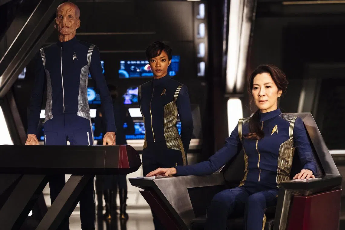 (From left) Doug Jones as Lieutenant Saru, Sonequa Martin-Green as First Officer Michael Burnham and Michelle Yeoh as Captain Philippa Georgiou.