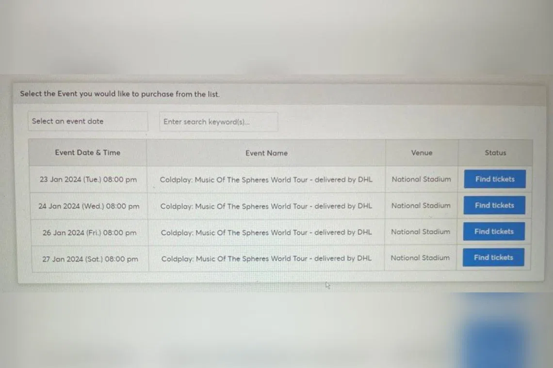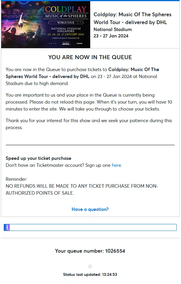 Ticket buyers typically advance from the virtual queue to a page to select the date and preferred ticket category, before being directed to the payment page. Ticket buyers can have multiple queue numbers if they access the pre-sale link from different devices, or have multiple accounts with the ticketing website.