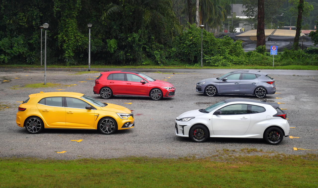 Four such hot hatches - the Volkswagen Golf GTI, Cupra Leon, Renault Megane RS and Toyota GR Yaris - are lined up here.