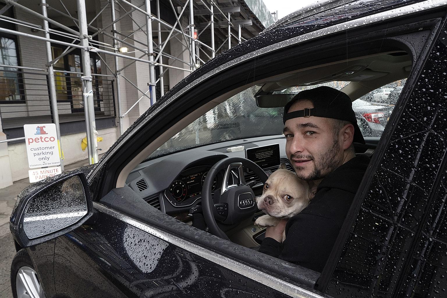 Mr Zach Sobel with his dog, Calvin, in Brooklyn last month. He recently left his car running outside a pet store and returned to find it had been stolen with his dog inside because he had left a spare key fob in the car.