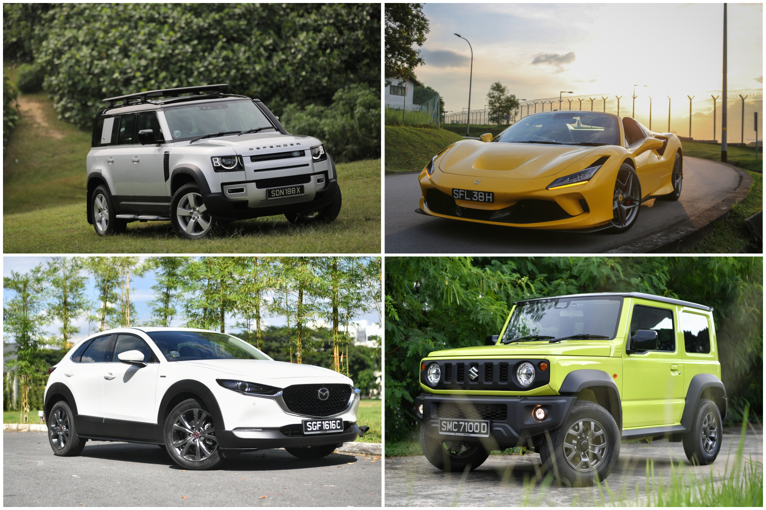 (Clockwise from top left) Land Rover Defender, Ferrari F8 Spider, Suzuki Jimny and Mazda CX-30.