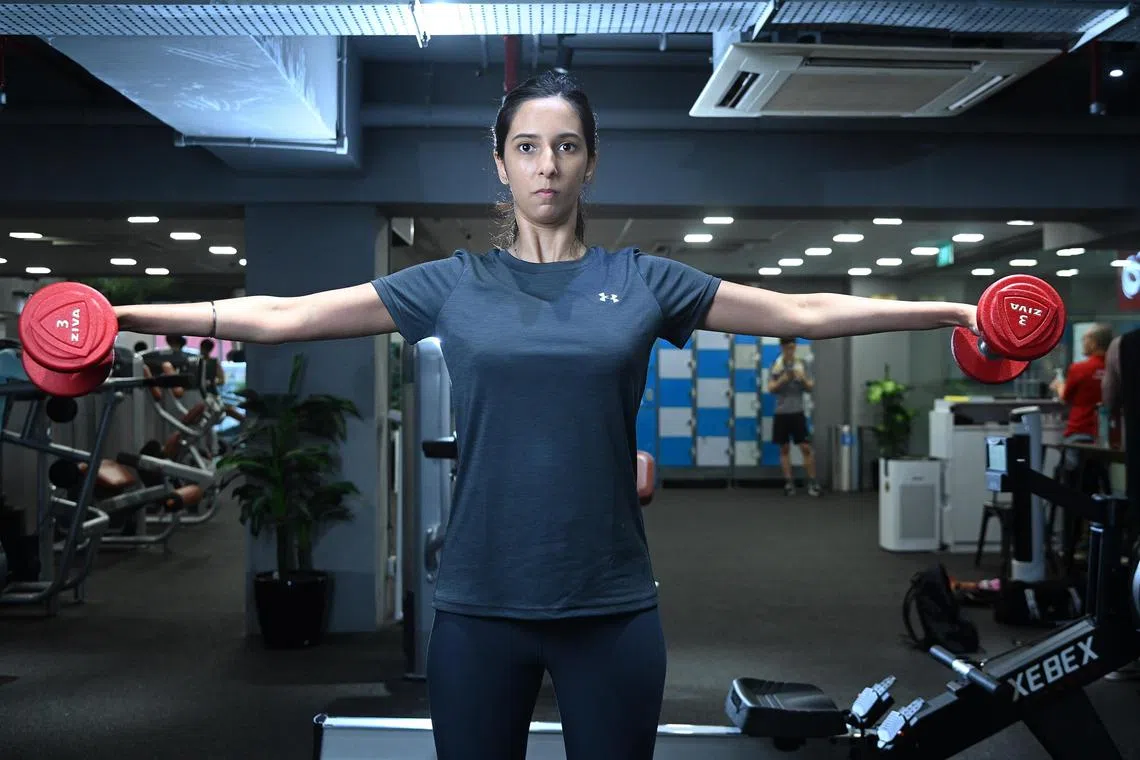 Writer Amrita Kaur doing a shoulder fly exercise at Bishan ActiveSG Gym.