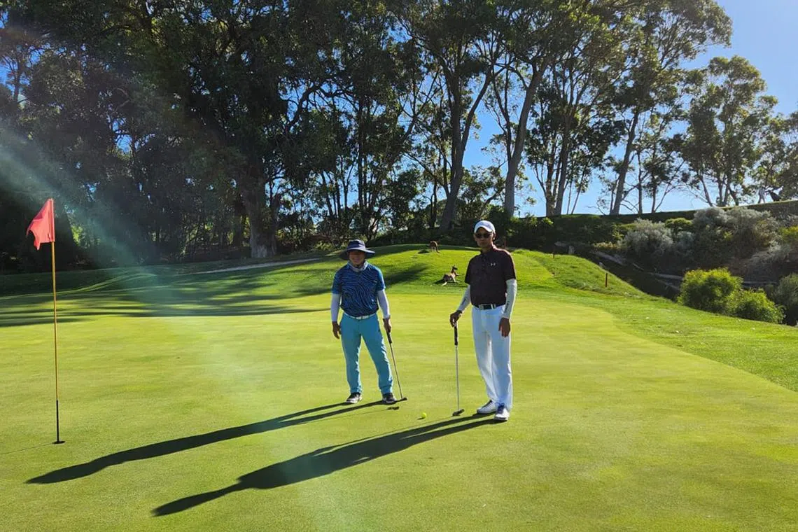 Mr Samuel Chia (left) spending the weekend golfing at Joondalup Golf Course in Perth in 2023.