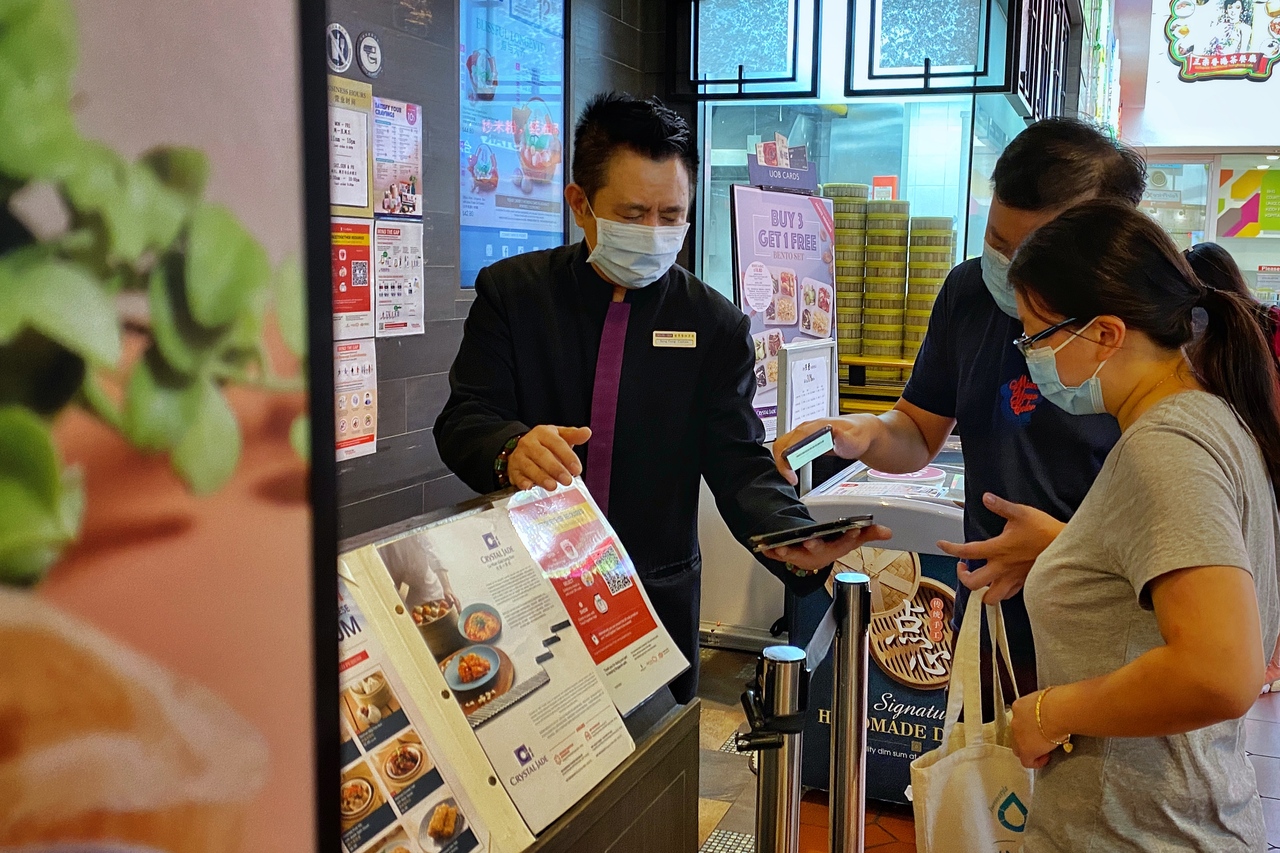 People have their vaccination status checked at a restaurant at Jurong Point on Aug 10, 2021.