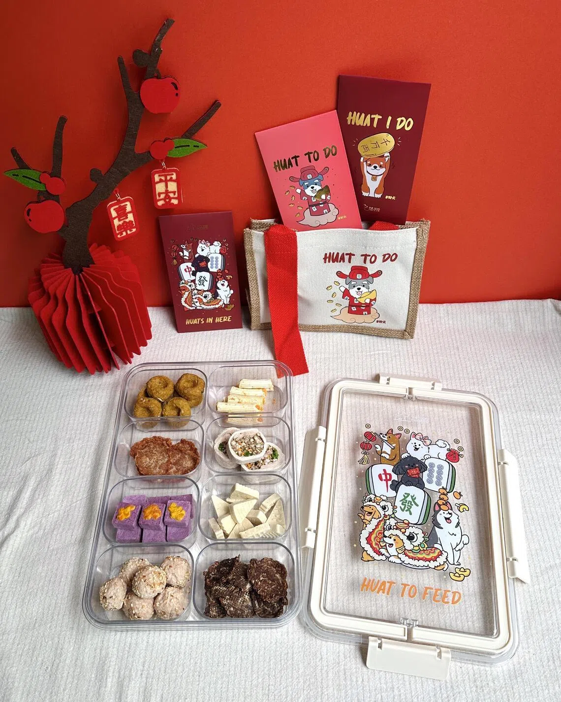 The Huats Up Bundle ($98), a collaboration with Treat Jar Co, is a multi-treat storage box resembling Chinese New Year snack containers. There are eight wholesome festive treats, such as Hei Bi Hiam Rolls, Golden Abacus Seeds and Orh Nee. Each bundle comes with a set of hongbao and a tote bag that can double as a mandarin orange carrier.