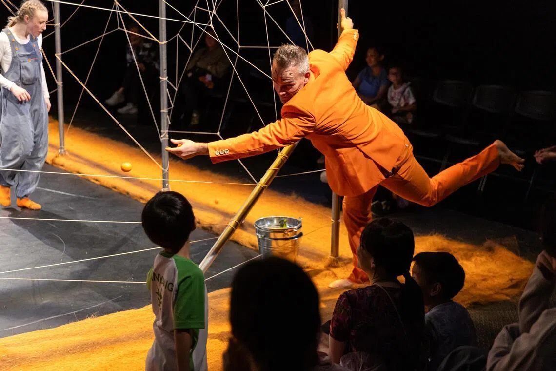 The grey atmosphere does not last long. Vince Virr, earlier playing Dad, returns as a very mischievous Tiger in a bright orange suit and stripes across his face. The air fills with the scent of oranges, as he crawls over the seats and through the audience, and rifles through bags.